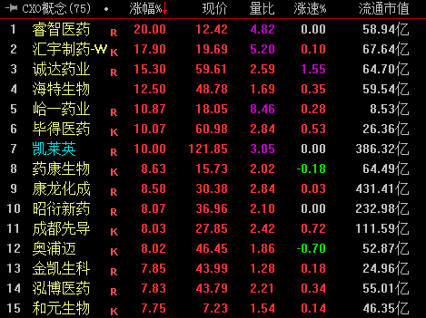具体来看,CXO概念板块走高,睿智医药、凯莱英涨停,药康生物、康龙化成等均涨超8%。