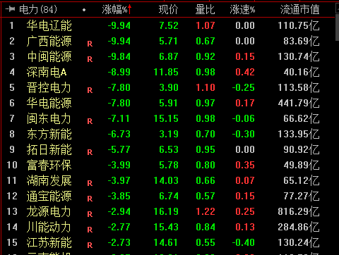 电力股延续调整,华电辽能、广西能源跌停,华电能源、闽东电力等9股跌超5%。